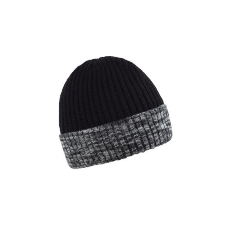 В’язана двошарова шапка з рельєфними рядами має досить широкий відворіт, зроблений у контрастній меланжевій гамі.