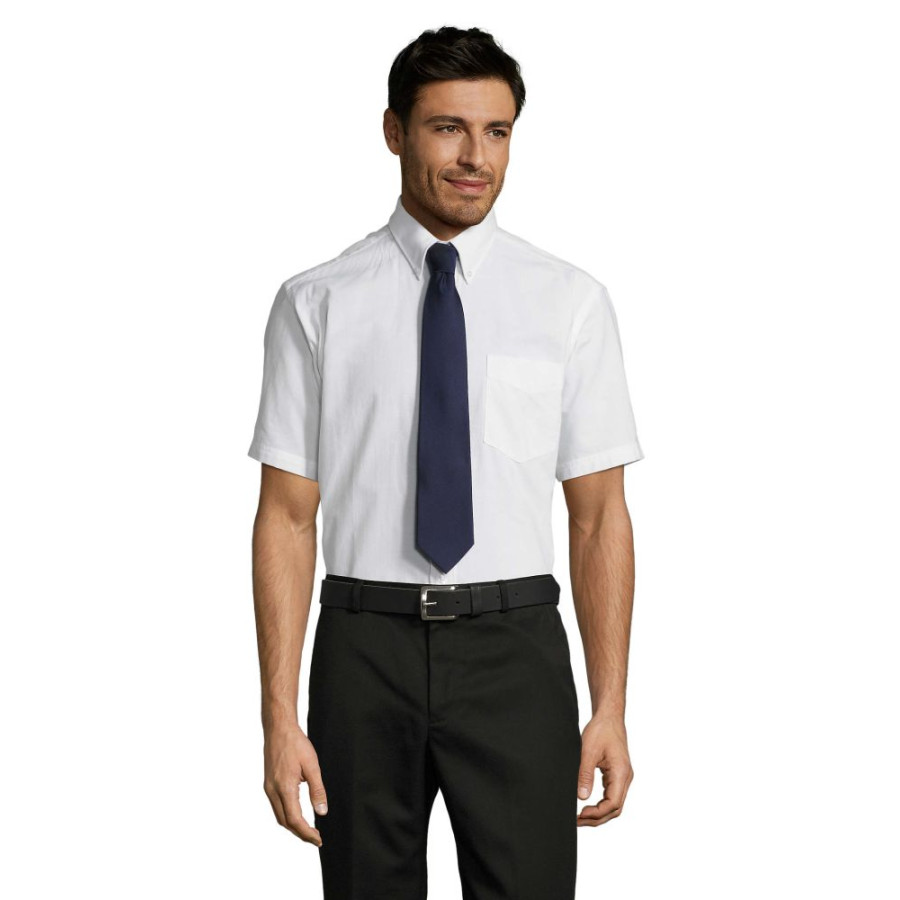 Сорочка чоловіча «Оксфорд» з коротким рукавом SOL'S BRISBANE. Нагрудна кишеня, зліва на спинці 2 симетричні складки, комір на 2 гудзики. Планка з сімома гудзиками тон в тон. Матеріал: 70% бавовна 30% поліестер; щільність: кольорова сорочка 135 г / м2, біла 130 г / м2, фарбована нитка. Варіант для жінок: ELITE-16030