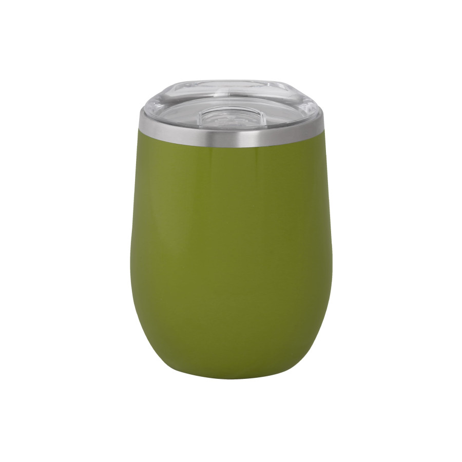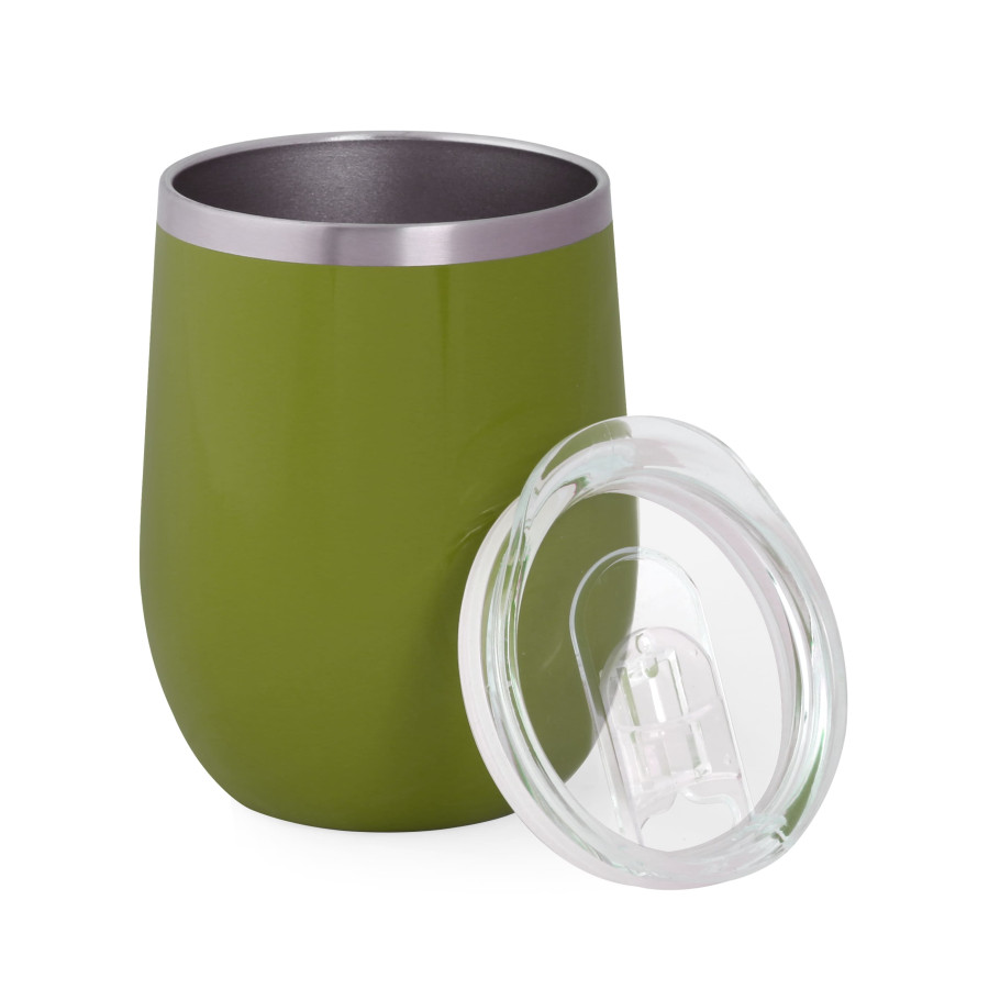 Металева термочашка з подвійними стінками з нержавіючої сталі ( глянцеве покриття емаль) і пластиковою прозорою кришкою з зсувним клапаном. Об'єм 350 мл. Індивідуальна картонна подарункова коробка. Розмір індивідуальної коробки: 12,5 х 9,7 х 9,7 см. Кришку можна мити в посудомийній машині. Корпус мити тільки вручну, щоб не пошкодити кольорове покриття. Підтримує температуру протягом 6-ти годин