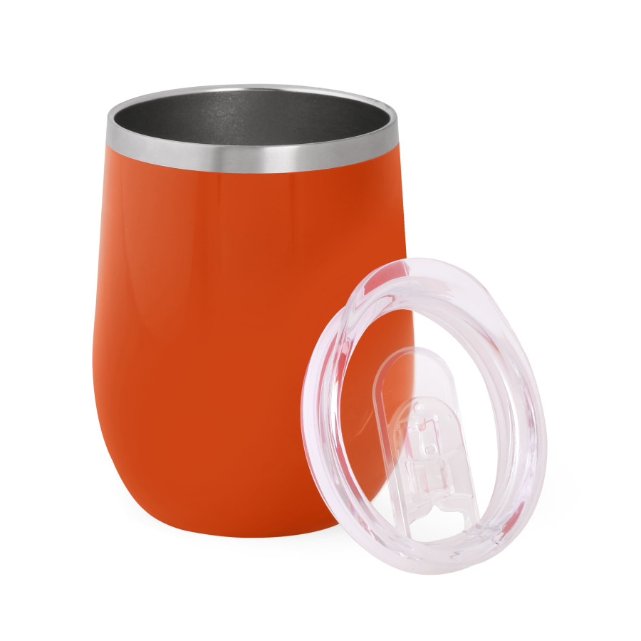 Металева термочашка з подвійними стінками з нержавіючої сталі ( глянцеве покриття емаль) і пластиковою прозорою кришкою з зсувним клапаном. Об'єм 350 мл. Індивідуальна картонна подарункова коробка. Розмір індивідуальної коробки: 12,5 х 9,7 х 9,7 см. Кришку можна мити в посудомийній машині. Корпус мити тільки вручну, щоб не пошкодити кольорове покриття. Підтримує температуру протягом 6-ти годин