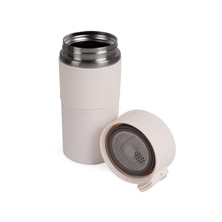 Вакуумна термокружка з нержавіючої сталі, вкрита матовою кольоровою емаллю. Кришка-непроливайка з ситечком, яка при необхідності блокується від випадкового відкривання. Об'єм 370 мл. Висота 18,3 см., діаметр 7,7 см. Підтримує температуру до 6 годин. Упакована в індивідуальну чорну коробку та поліетиленовий пакет. Розмір індивідуальної коробки: 19 х 8 х 8 см.