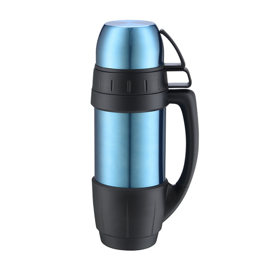 Об’єм вакуумного термоса – 1200 мл. Виріб має велику ручку для перенесення, що робить його використання максимально комфортним. Оригінальна комбінована кришка складається з двох чашок з ручками, в які можна наливати гарячий чай. Кришка виконана з харчового поліпропілену.