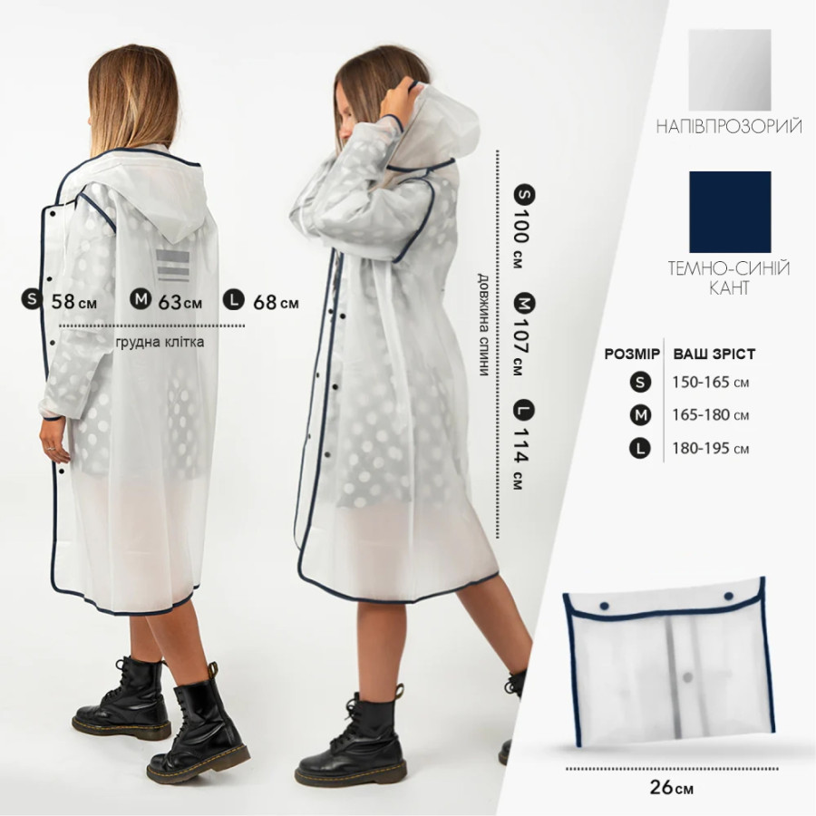 Дощовик можна підібратидля людей різного росту – від 150 до 190 см: S - 150-165 см, M - 165-175 см, L - 175-190 см. Чохол 26 см.
