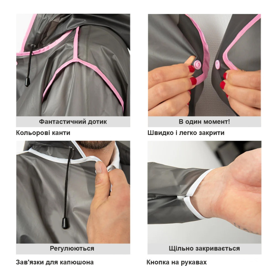 В згорнутому вигляді плащ має компактні габарити. Він продається в маленькому водонепроникному чохлі, який можна носити з собою в сумці. Це прекрасна альтернатива парасолі.