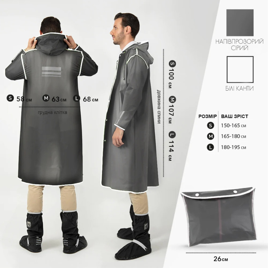 Дощовик можнапідібрати для людей різного росту – від 150 до 190 см: S - 150-165 см, M - 165-175 см, L - 175-190 см. Чохол 26 см.
