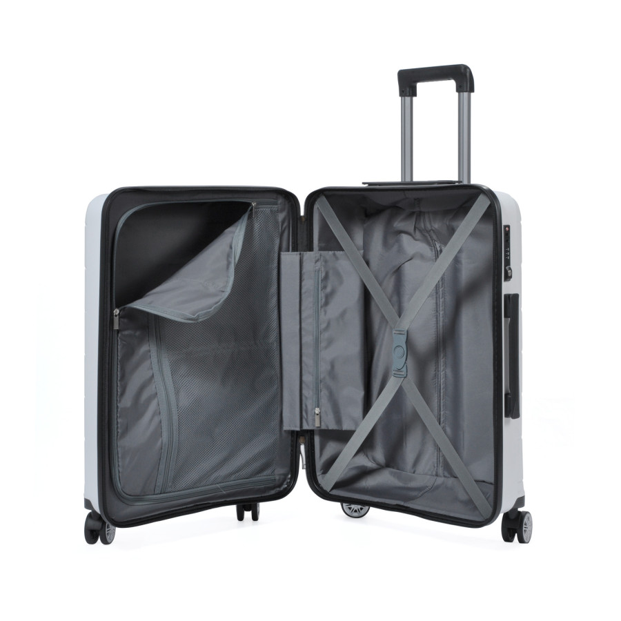 Надлегка та міцна валіза на 8-ми (4х2) колесах TM Columbus. Оснащена кодовим замком системи TSA, телескопічною алюмінієвою ручкою з фіксаторами. Всередині обшита тканиною, має 2 відділення, що розділяються діафрагмою та кишеню на блискавці для дрібних речей; еластичні паски для фіксації речей.