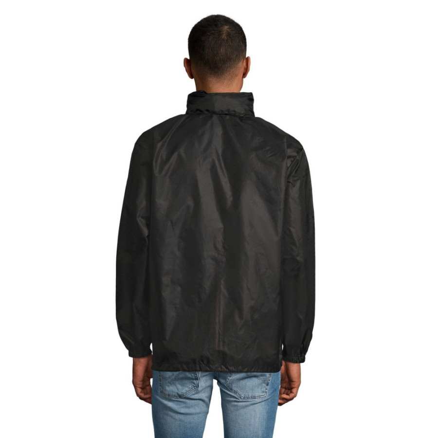Вітровка унісекс без підкладки. Водовідштовхувальна та вітрозахисна тканина. Капюшон складається в комір на блискавку. Дві кишені на блискавці, манжети оброблені рібом. Регулююча кулиска на капюшоні і по низу куртки.