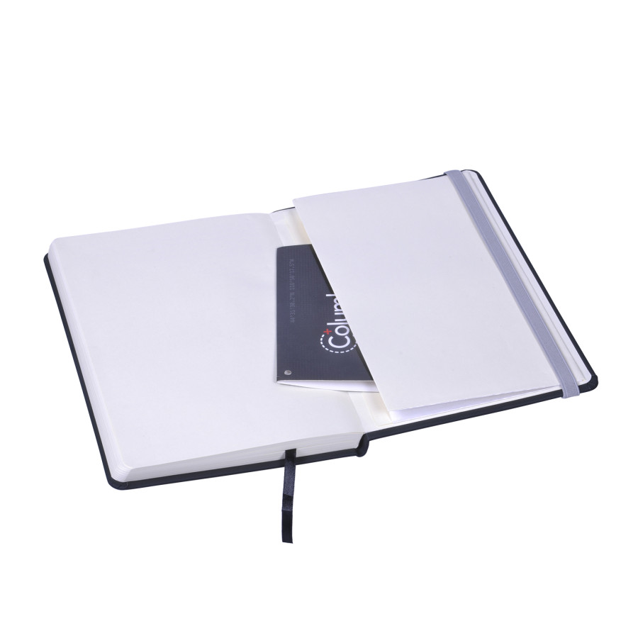 Тверда та приємна на дотик обкладинка з широкою резинкою. Є можливість додати металеву шильду під нанесення логотипу (постачається окремо). Кремовий папір. Внутрішня кишеня, 8 аркушів з перфорацією для легокого відривання.