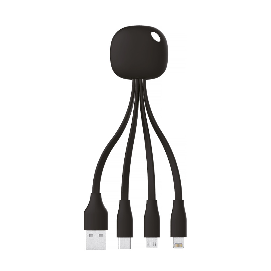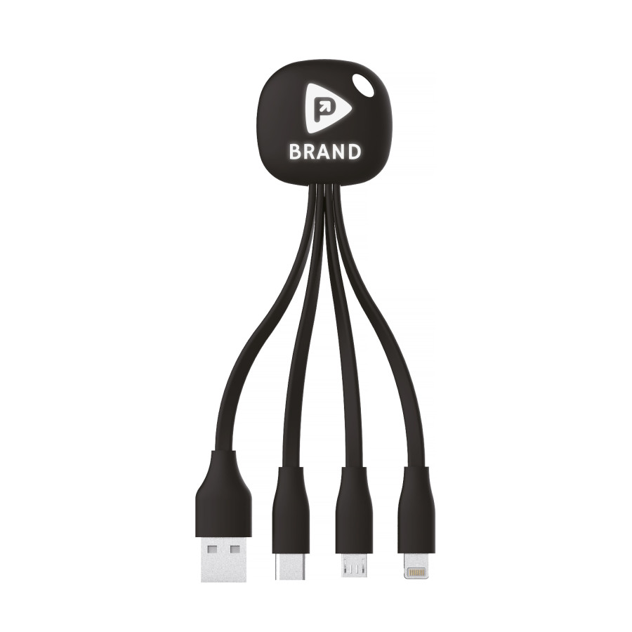 Універсальний кабель 3-в-1 для зарядки гаджетів із білою світлодіодною панеллю. Довжина 13,4 см. Має стандартний USB вхід для підключення живлення та три різні виходи Micro USB, Lightning, Type-C.