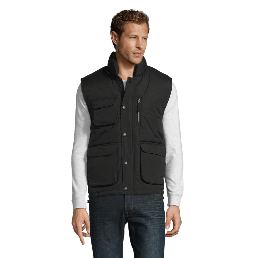 Жилет унісекс SOL'S VIPER. Стьобаний комір-стійка, безліч кишень, отвори для гарнітури в кишені і на комірі, звужена пройма рукавів для захисту від вітру, стягуюча резинка на талії. Матеріал: Мікроволокно з просоченням ПВХ, підкладка з поліестеру 190T, водонепроникна м'яка текстура.