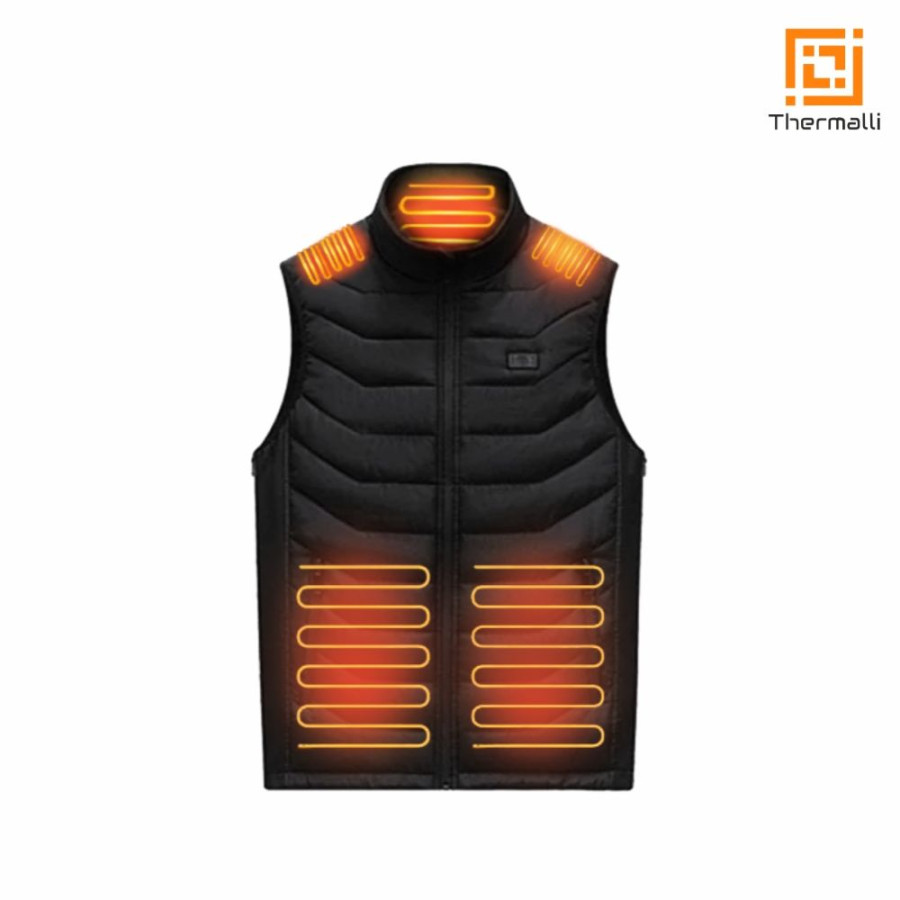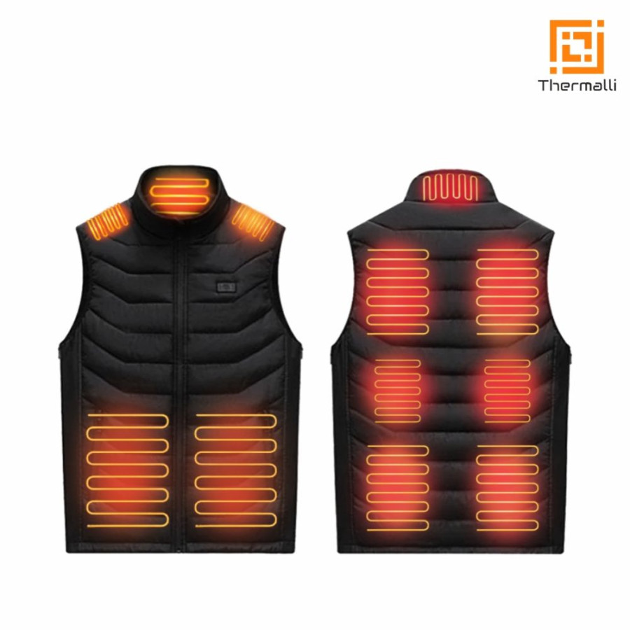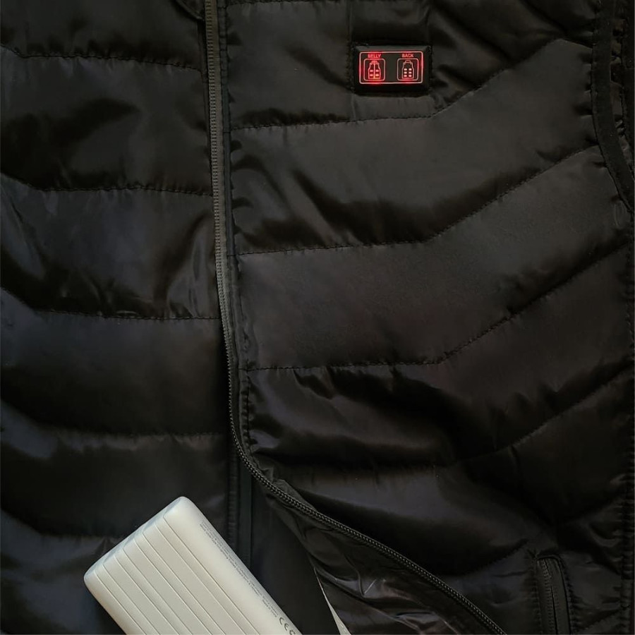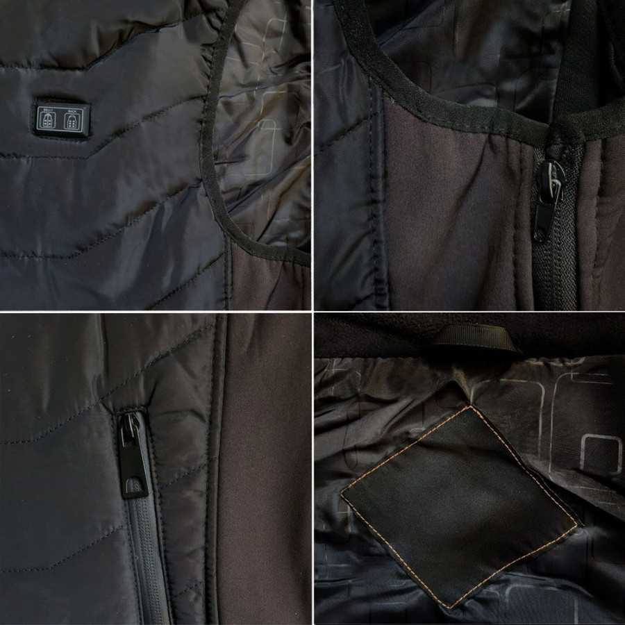 Жилет досить потужно генерує тепло, виріб має 11 зон нагріву. Спереду на рівні живота вмонтовані 2 зони обігріву, 2 зони – на плечах, 1 – на комірі. Найбільше нагрівальних елементів на спині, тут 6 зон обігріву, які розміщені симетрично 3 х 3.